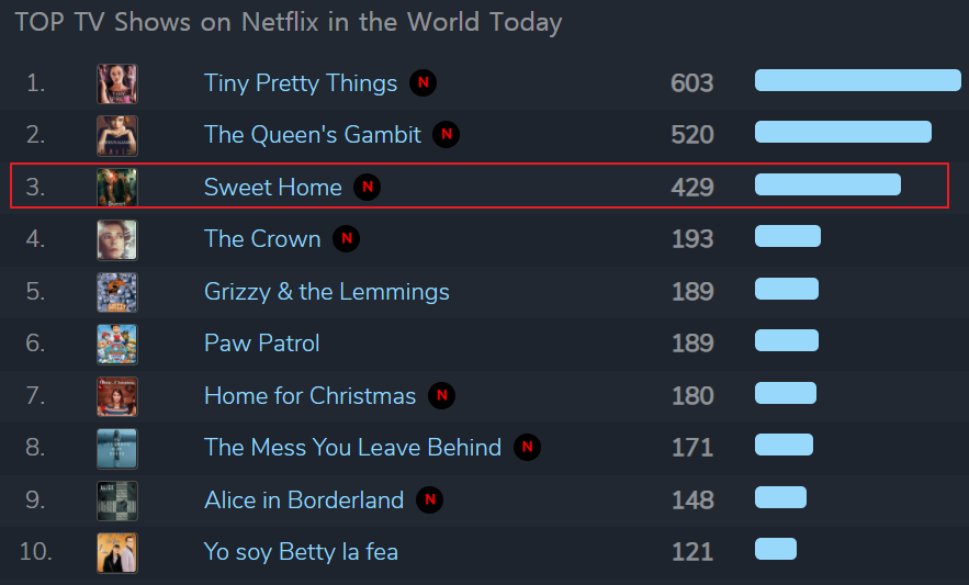 넷플릭스 드라마 <스위트홈>이 강세다.